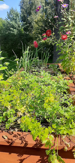 Rozmaryn na zimę przesadziłam do donicy i zabrałam do domu a majeranek, pietruszka, kilka cebulek na szczypior i tymianek cały czas rosną. Największą zaletą było to, że wreszcie ślimaki nie weszły po nogach skrzynek bo je zabezpieczyliśmy i nie zjadły wszystkiego.